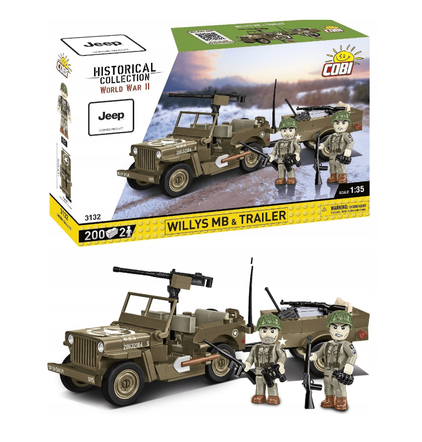 COBI Willys MB & Trailer to doskonały wybór dla każdego, kto lubi historię, pojazdy wojskowe i porządną zabawę. Bo czasem najlepsze przygody zaczynają się od… dwóch figurek i 200 klocków!