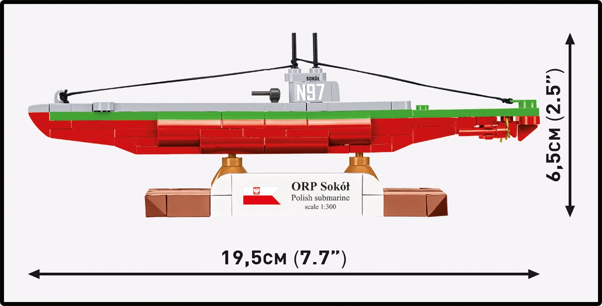 Złożony okręt, ustawiony na dołączonej, czarnej podstawce, prezentuje się niezwykle prestiżowo. Dzięki swojej smukłej formie bez problemu znajdzie się dla niego miejsce na każdym biurku, regale z książkami czy w gablocie. Historyczna, surowa kolorystyka okrętu podwodnego świetnie odnajduje się w niemal każdym wnętrzu, przyciągając wzrok i stanowiąc rewelacyjny punkt wyjścia do rozmów o dokonaniach Polaków.