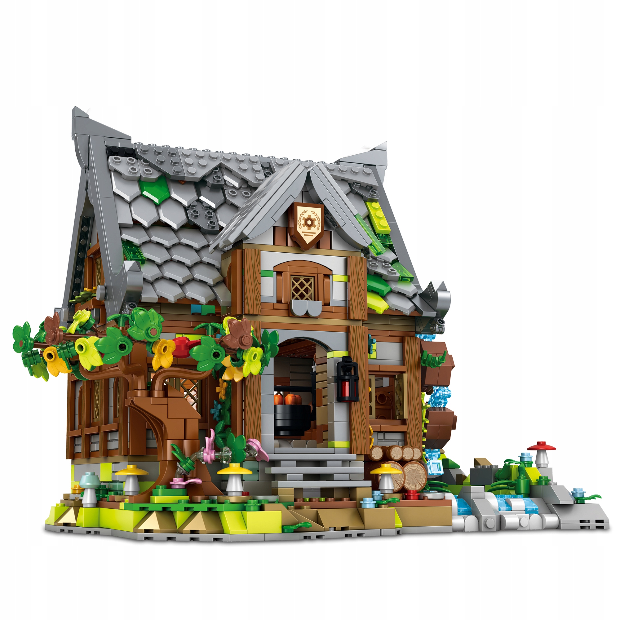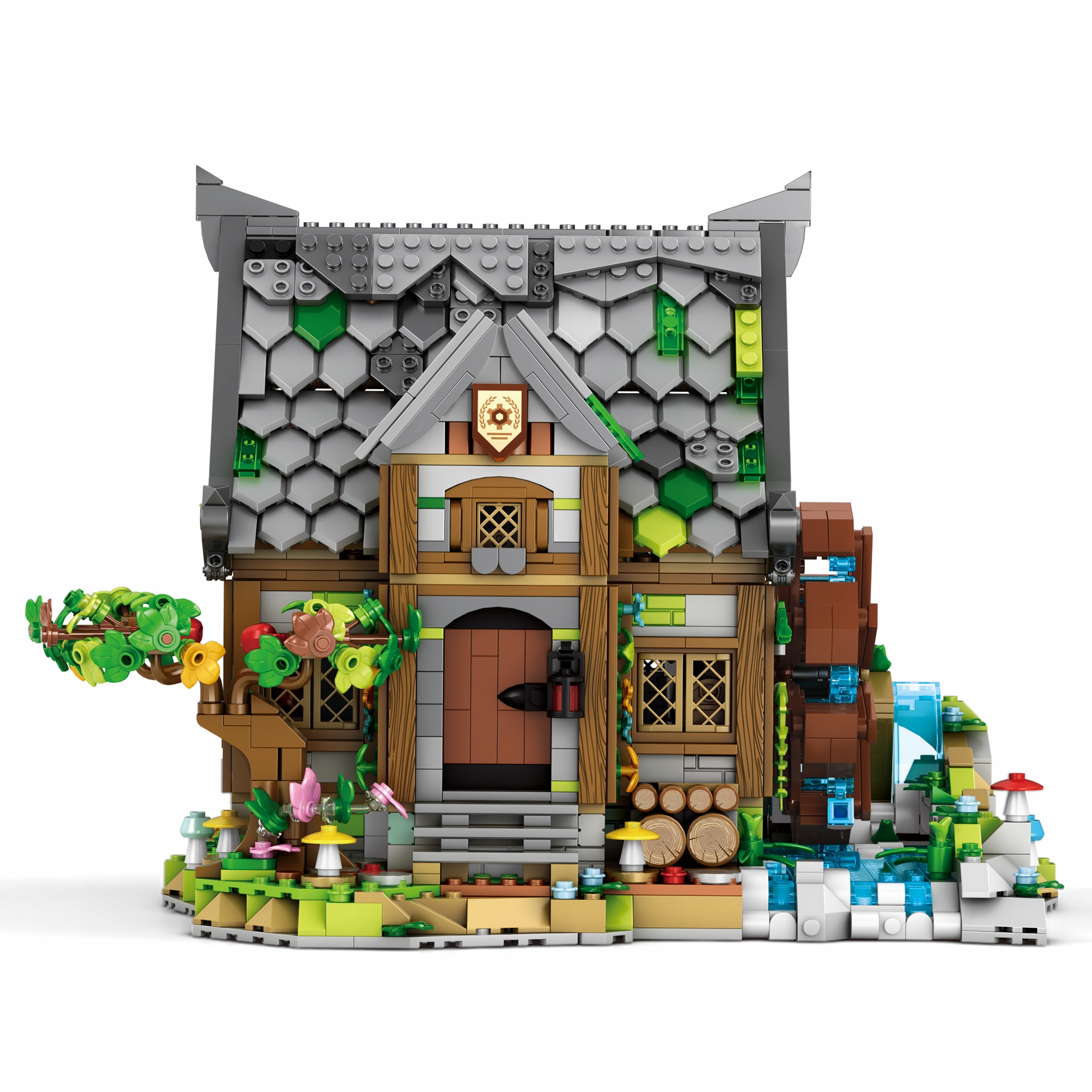 W średniowieczu młyn był strategicznym i najbogatszym punktem każdej osady, a ten model bezbłędnie oddaje ten klimat. Głównym atutem wizualnym konstrukcji jest potężne koło łopatkowe zamontowane z boku budynku. Połączenie masywnych, kamiennych fundamentów z lżejszą, drewnopodobną nadbudówką oraz pnącą się roślinnością tworzy spójny, historyczny projekt, obok którego po prostu nie da się przejść obojętnie.