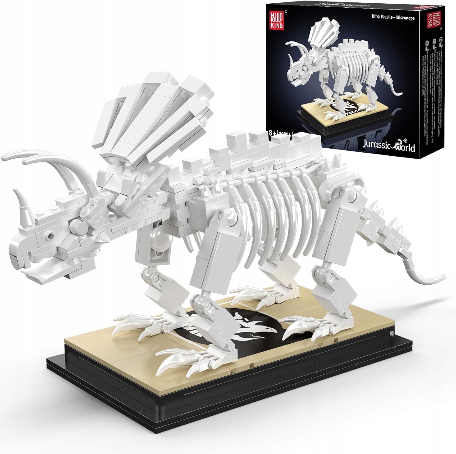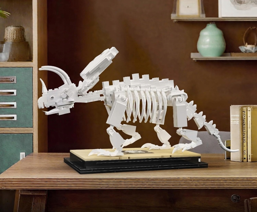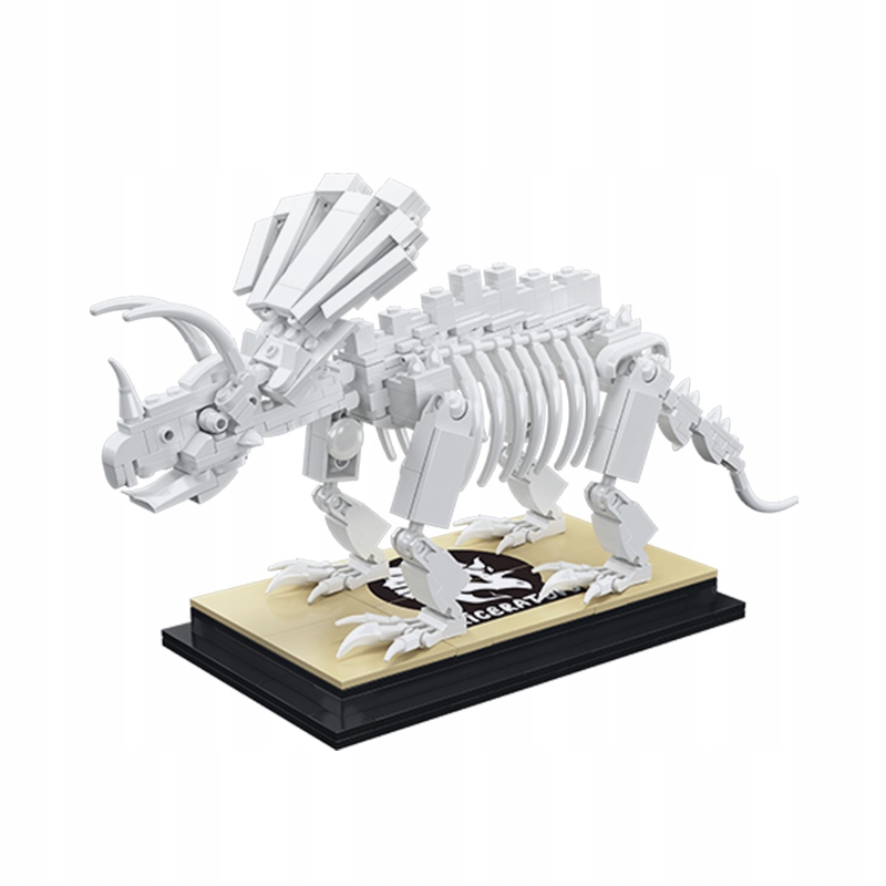 Wiele klocków po złożeniu ląduje w pudle, ale ten projekt od początku został stworzony z myślą o dumnej ekspozycji. Dzięki dedykowanej, ciemnej podstawie i tabliczce z nazwą gatunku, gotowy Triceratops wygląda jak pomniejszony eksponat prosto z muzeum historii naturalnej. Kontrast jasnych kręgów i żeber na czarnym tle sprawia, że model prezentuje się niesamowicie elegancko, stając się unikalną dekoracją każdego nowoczesnego wnętrza, gabinetu lub pokoju młodzieżowego.