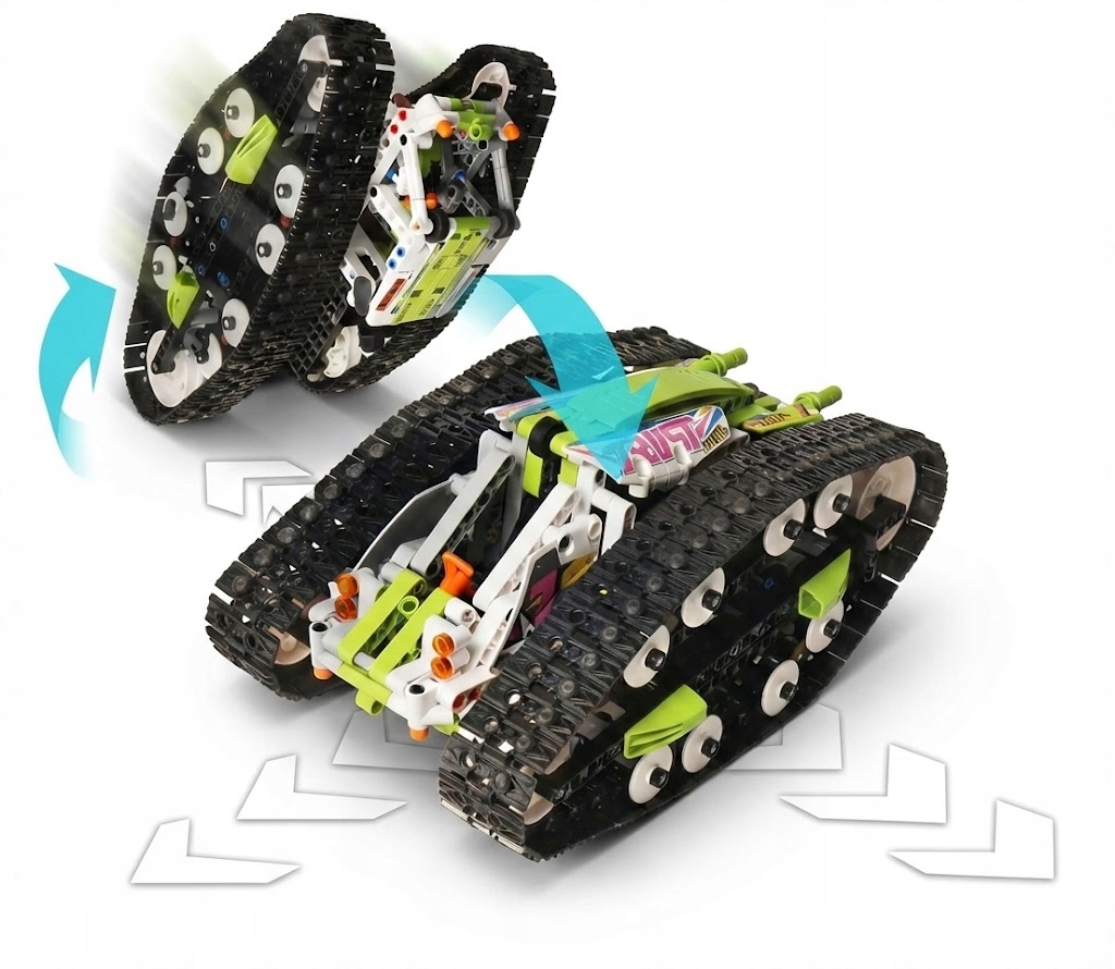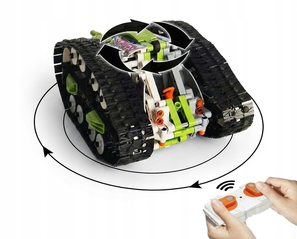 - Trakcja gąsienicowa: Zamiast kół – szerokie gąsienice. Dzięki nim pojazd ma niesamowitą przyczepność. Może obracać się w miejscu o 360 stopni („bączki”), pokonywać wysokie progi i jeździć po trudnym podłożu (dywan, trawa, piach).