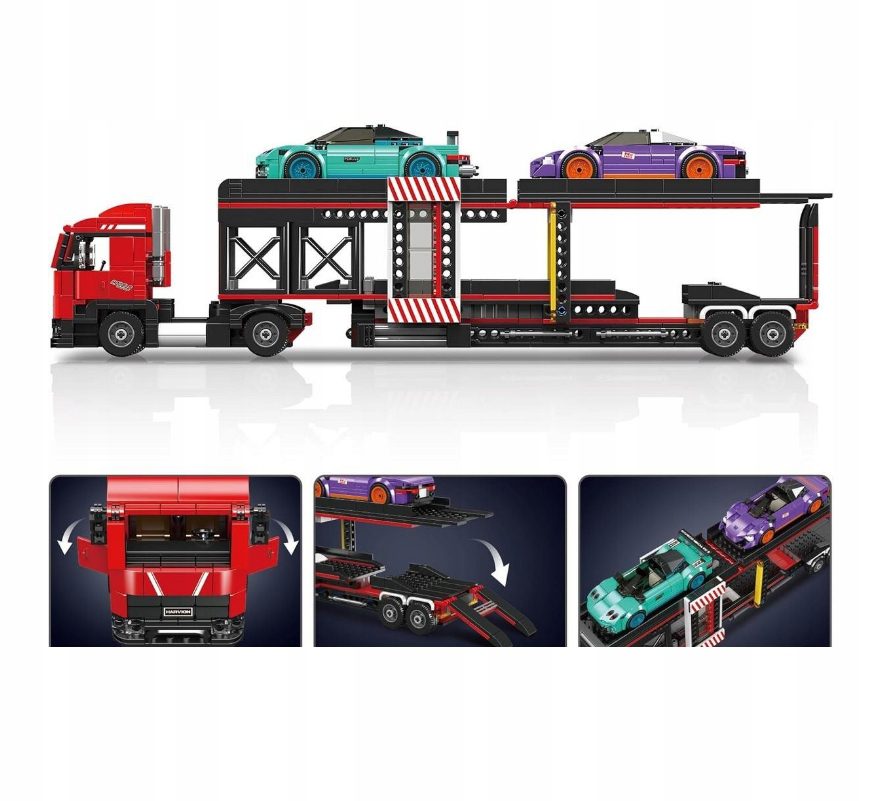 Ten zestaw to marzenie każdego fana motoryzacji. Z 997 klocków zbudujesz nie tylko potężną, ciężarówkę-lawetę, ale także sportowe auta , które idealnie mieszczą się na jej naczepie. Ciężarówka została zaprojektowana z dbałością o detale, a jej największą atrakcją jest w pełni funkcjonalna, odczepiana naczepa. Posiada ona dwupoziomowy pokład oraz opuszczaną rampę, co pozwala na realistyczną zabawę w załadunek i rozładunek dołączonego sportowego samochodu.