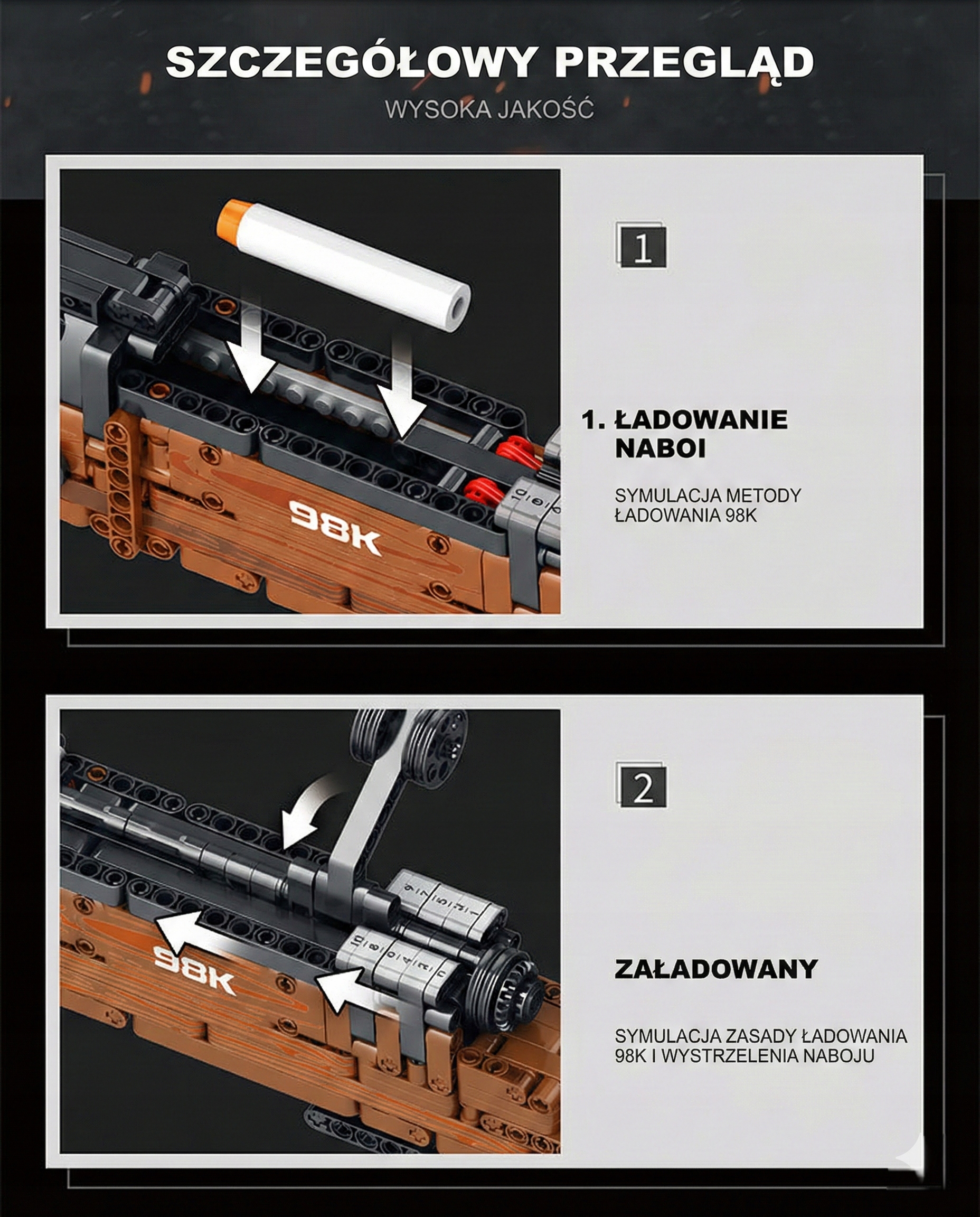 Mauser Karabiner 98k to absolutna ikona militariów. Jako podstawowy karabin piechoty w pierwszej połowie XX wieku, zasłynął z niezawodności i doskonałej celności, stając się bazą dla wielu późniejszych konstrukcji snajperskich. Posiadanie jego wiernej repliki to gratka dla każdego miłośnika historii i rekonstrukcji. Zbudowanie go z klocków pozwala na nowo docenić geniusz dawnych rusznikarzy.