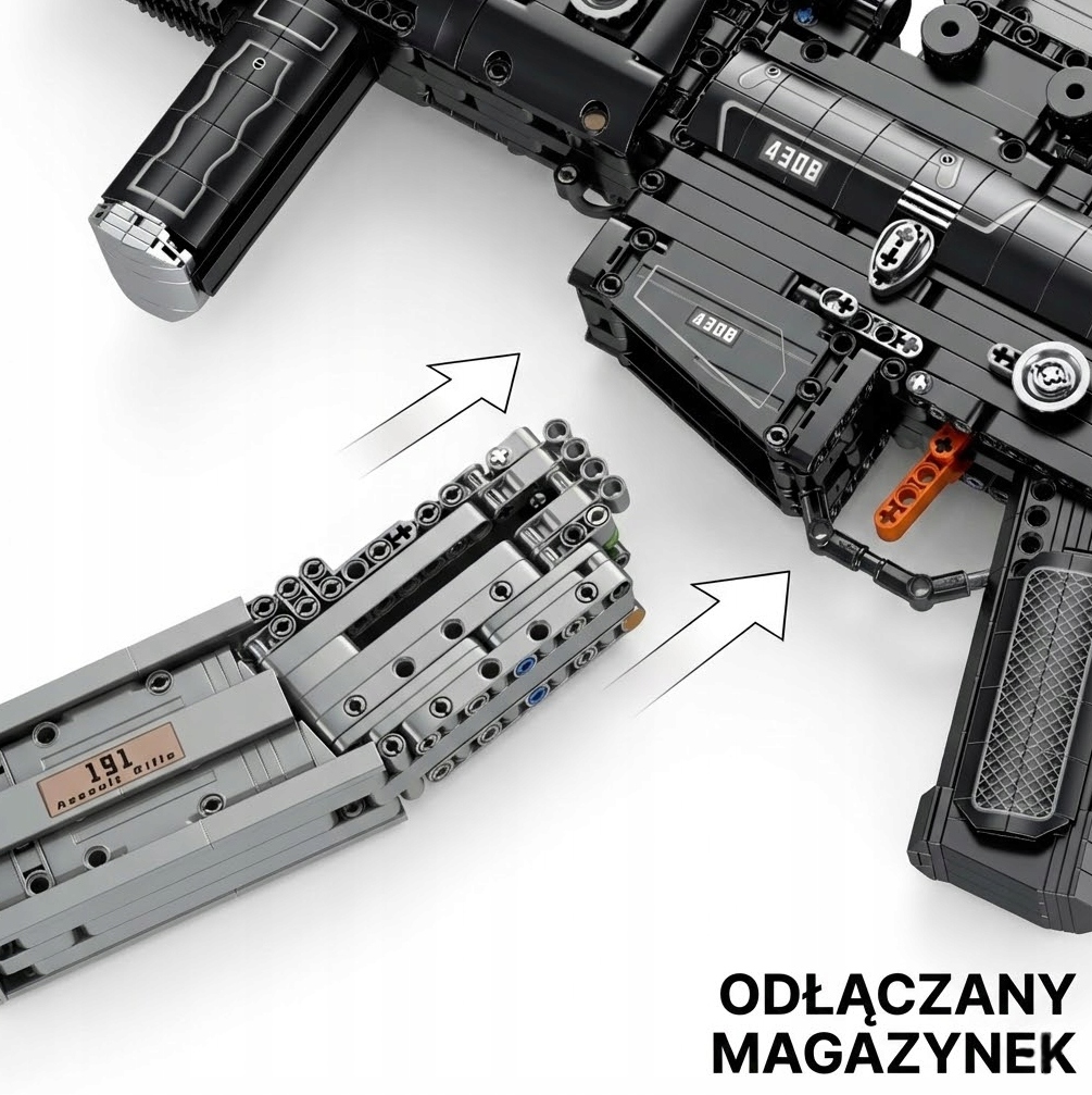 - Działający mechanizm strzelający: Ten model nie służy tylko do oglądania! Karabin wyposażony jest w bezpieczny mechanizm sprężynowy, który pozwala na oddawanie strzałów plastikowymi „pociskami” (klockami technicznymi). Przeładuj zamek, naciśnij spust i traf w cel.