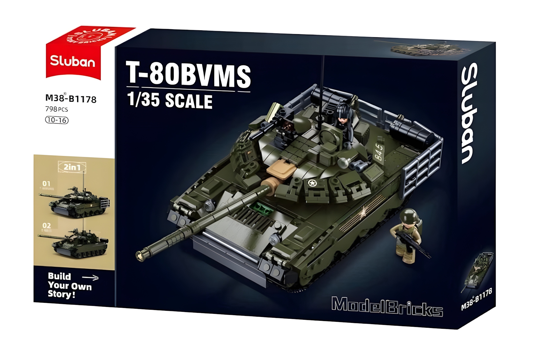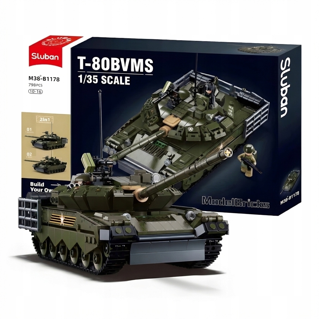 Sluban M38-B1178 Rosyjski Czołg T-80BVM to szczegółowy, 798-elementowy zestaw z serii Army, przedstawiający jeden z najnowocześniejszych czołgów podstawowych w arsenale rosyjskim. Model odwzorowuje wersję z pancerzem reaktywnym, posiada ruchome elementy i 2 figurki czołgistów.