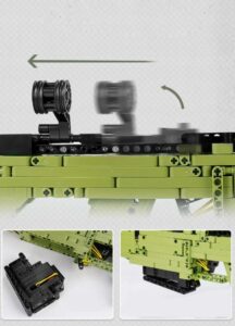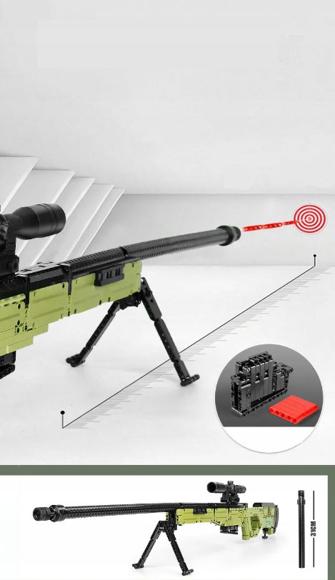 Model został wyposażony w funkcję manualnego ładowania, realistyczny magazynek mieszczący 5 pocisków z klocków, celownik optyczny oraz statyw snajperski, który umożliwia stabilne ustawienie repliki. Całość została zaprojektowana z myślą o bezpiecznej zabawie i ekspozycji – nie zawiera ostrych krawędzi ani niebezpiecznych mechanizmów. Zestaw przeznaczony jest dla osób powyżej 14 roku życia.