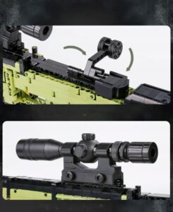 Model został wyposażony w funkcję manualnego ładowania, realistyczny magazynek mieszczący 5 pocisków z klocków, celownik optyczny oraz statyw snajperski, który umożliwia stabilne ustawienie repliki. Całość została zaprojektowana z myślą o bezpiecznej zabawie i ekspozycji – nie zawiera ostrych krawędzi ani niebezpiecznych mechanizmów. Zestaw przeznaczony jest dla osób powyżej 14 roku życia.