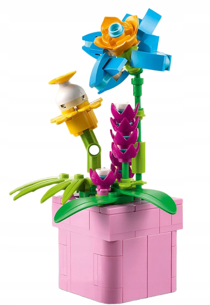 - Kącik Pisarza: Stwórz spokojną, artystyczną kompozycję na swoje biurko. Ten wariant to urocza doniczka z bujnym bukietem kwiatów, obok której postawisz zbudowane z klocków pióro oraz mały notatnik.