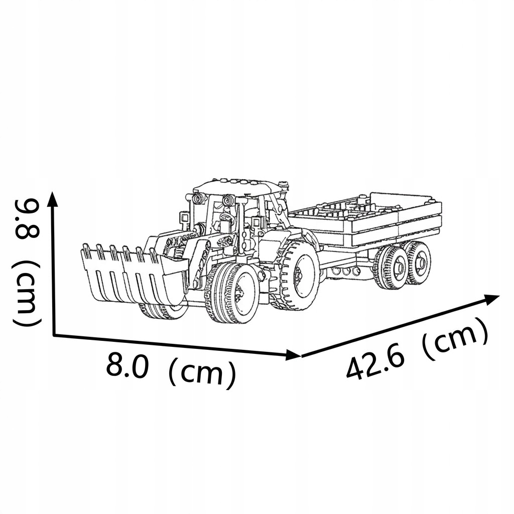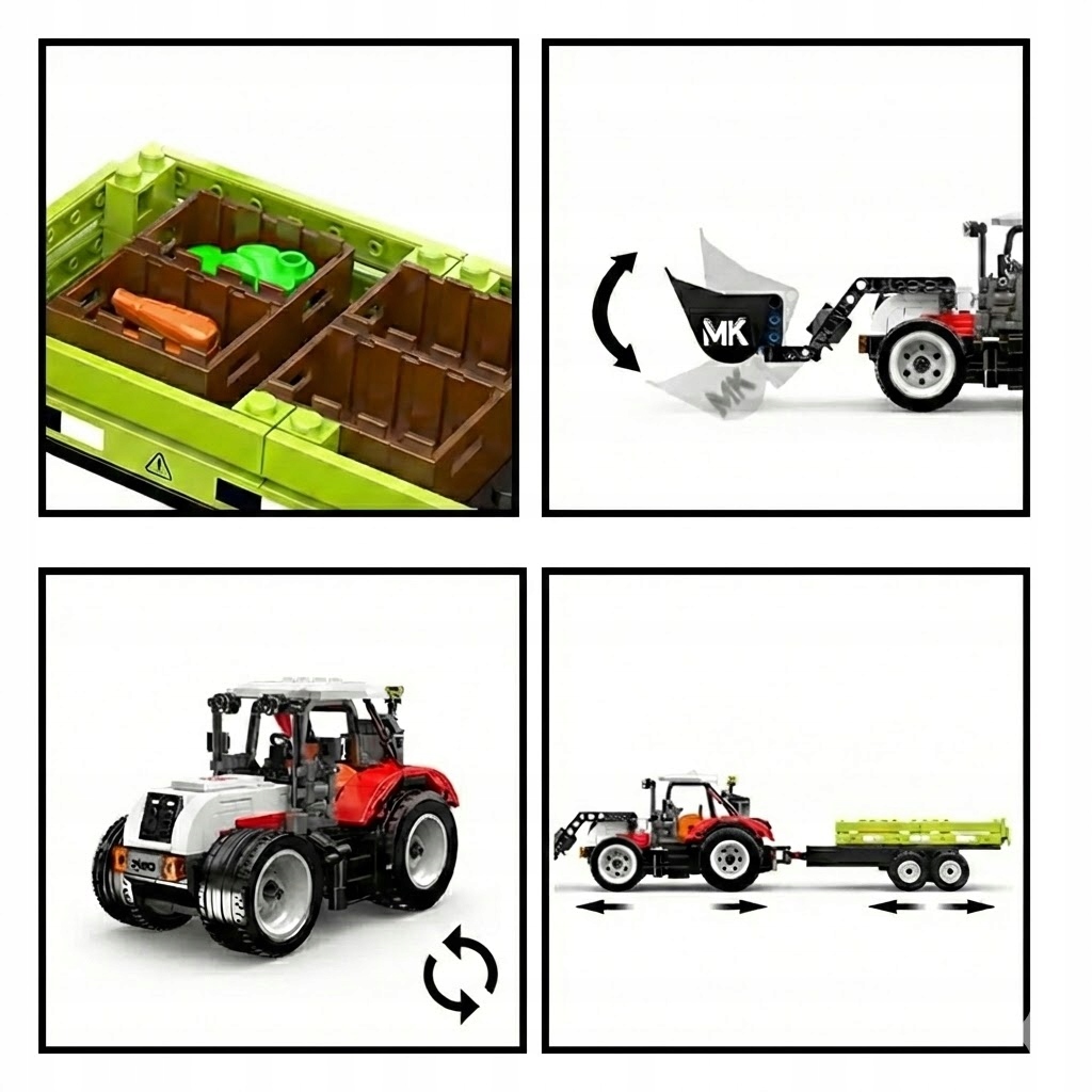 Model wyróżnia się swoją wszechstronnością. Zielony ciągnik wyposażony jest w ruchome ramię z łyżką (tur), którym można nabierać i podnosić klocki. Dołączona do zestawu przyczepa posiada funkcję wywrotu lub otwierane burty (zależnie od wariantu konstrukcji), co ułatwia rozładunek. Solidny zaczep sprawia, że przyczepę można łatwo odpiąć, by używać samego traktora. Duże, bieżnikowane opony dopełniają całości, nadając maszynie masywny, terenowy wygląd.